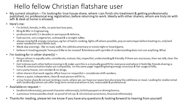 My current situation – I’m looking for true house-share, where i can finish nhs treatment & getting professionally published, inc professional eng registration, before returning to work. Ideally with other sharers, whom are truly ok with wfh & desk at home is allowed. Please see attached jpg for more background information about myself. Thanks for reading, please let me know if you have any questions & looking forward to hearing from yourself.