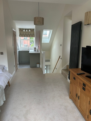 The studio flat includes exclusive use of an en-suite shower room and kitchenette, and has pleasant views over the back garden via a juliette balcony.