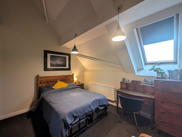 The room comes fully furnished with a double bed, wardrobe and bedside furniture (a desk can be provided if needed). You’ll share a bright open-plan living and kitchen area, equipped with a dishwasher and washing machine, and a shared bathroom.