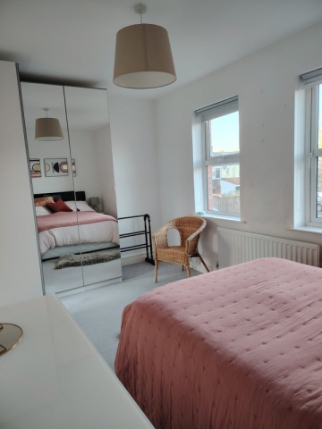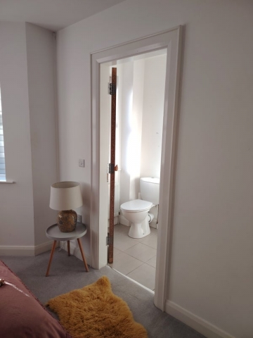 On the first floor, Room 1, is a backward facing double bedroom, with memory foam topper and spring mattress bed with divan, overlooking the garden & private carpark. The bedroom has mirrored wardrobes, and double unit drawers, with storage in drawers under the bed too. The shared bathroom is used on the majority by Room 1 occupant (as other bedrooms have ensuites) and on occasion for baths/ showers by the other residents.