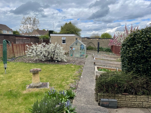 A driveway at the front with space for three cars and a large back garden with green house and beds for growing vegetables.