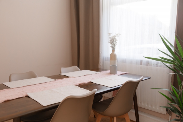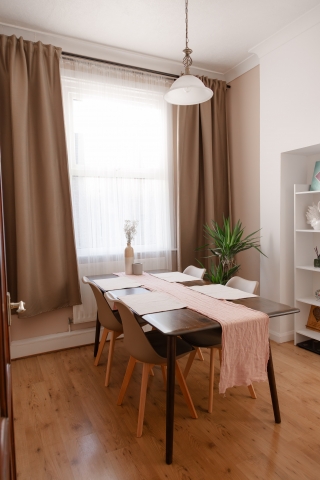 - Bright shared dining area
