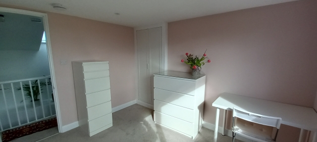The room has a desk, chest of drawers and a built-in wardrobe.