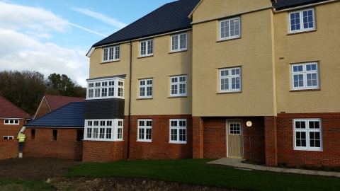 The west facing front door is approached by a footpath over grass. The east facing rear entrance from the enclosed car parking area overlooks gardens. This side of the block has just six flats, two on each floor, so it is very private.