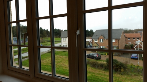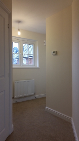At the end of the corridor (see photo) is the dual aspect lounge/diner/kitchen. The solid amtico floor is easy to keep clean. The kitchen looks east over gardens, and the lounge looks westwards over grass and a footpath to more houses - both windows have blinds, the lounge also has a curtain rail.
