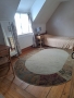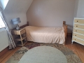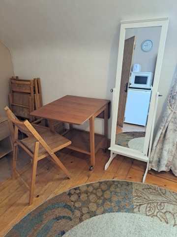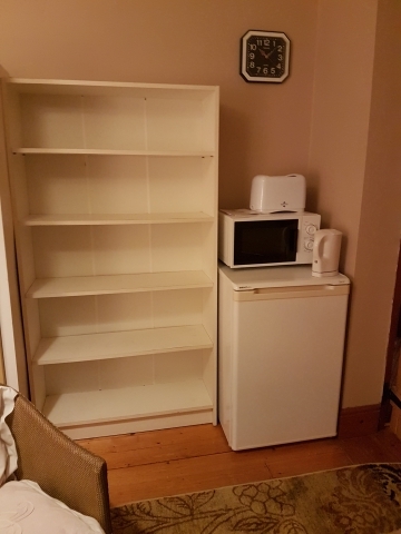 The single upstairs bedroom (16' x 9') is furnished with a single bed, bedside table, chest of drawers, cheval mirror, small table and chairs, TV stand, wardrobe, rug and oval carpet, shelf unit, microwave, toaster, and fridge, with fridge- freezer downstairs.