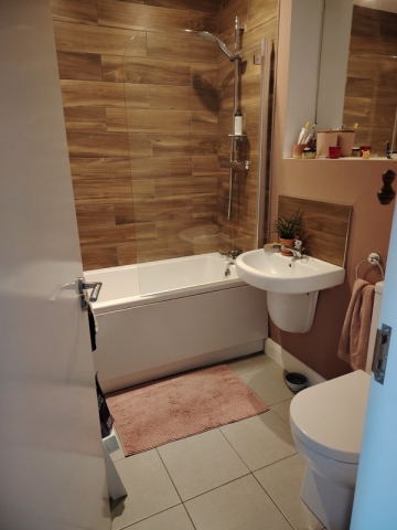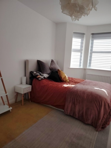 On the first floor, Room 1, is a backward facing double bedroom, with memory foam topper and spring mattress bed with divan, overlooking the garden & private carpark. The bedroom has mirrored wardrobes, and double unit drawers, with storage in drawers under the bed too. The shared bathroom is used on the majority by Room 1 occupant (as other bedrooms have ensuites) and on occasion for baths/ showers by the other residents.