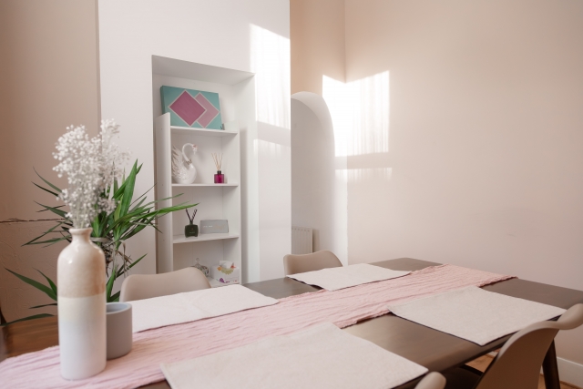 - Bright shared dining area