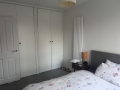 An upstairs room in a well-decorated maisonette in Bow, with a double bed and two large, built-in storage cupboards. The room is at the front of the house, looking onto a green space across the road.